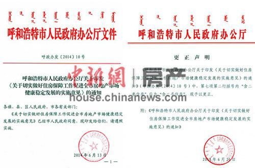 6月26日上午9时左右,呼和浩特房地产开发监督管理处网站发表“更正声明”,声明称将第七项第二行括号内“含二套住房”改为“含二手住房”,两份文件仅仅一字之差,同时刊载呼和浩特市人民政府办公厅关于印发《切实做 ..