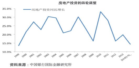 第一轮为1999-2002年。在这一阶段,房地产市场开始启动,投资迅速增长,年平均投资增速约为21.3%。第二轮在2003-2005年。为抑制2003年以来出现的房地产投资过热,政府主要采用收紧土地供给和降低信贷等方式来促进房地产市场平稳发展。在此背景下,房地产投资由2003年顶峰时的30.3%下降至2005年的20.9%。此轮调整过程中,海南等房地产市场受到了较为严重的冲击。 第三轮在2006-2009年。在此阶段,房地产市场逐渐修复,并于2007年再次迎来了房地产投资的快速增长,当年房地产投资增长30.3%,成为仅次于2010年的次高增速。在此背景下,调控政策加码,重点通过打击囤地、提高首付等方式抑制投资过热。此后,房地产投资增速开始下行。但是2008年金融危机的爆发,使得这一进程被打破。2009年上半年,随着利率打折等一系列救市措施的出台,房地产投资和销售再次快速增长,房地产市场急剧升温。 第四轮为2010-2012年。在销售爆发式增长和信贷大规模投放双重带动下,2010年房地产投资大幅上涨,达到33.2%的历史最高涨幅。在此背景下,调控全面加码,涉及土地供给、限购、信贷、税收、二手房交易等。受此影响,房地产投资从2011年开始逐步下行,并于2012年达到阶段性底部。 最近一轮调整于2013年启动。受前期累积性需求的报复性反弹和各地变通执行调控政策的影响,2013年房地产投资再次出现了快速上涨。但是,受政府加强对影子银行问题的治理,房地产企业资金链趋于紧张;同时,个人住房贷款的可获得性也有所降低,这种偏紧的信贷条件导致房地产投资在今年上半年出现了较快下行。 未来一段时间,由于信贷趋紧、销售下滑等原因,本轮调整可能会持续2-3年。但是,在新的“分类指导”调控政策作用下,区域性的供求失衡矛盾有望得到缓解,银行业对首次置业、保障性住房等领域的信贷支持仍将保持稳定甚至扩大,房地产投资及销售或将在2016年前后有新的表现。但是,与上一轮增长不同,新一轮增长或将呈现中速增长、双向波动、差异化发展、形态更叠的“新常态”。 结语 房地产投资下行确实会对GDP增长带来一定的不利影响,但发生断崖式下跌可能性较小,此轮调整可能会持续2-3年。(本文作者系中国银行国际金融研究所副所长宗良、宏观研究员李佩珈) |