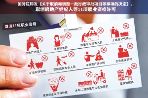 8月中旬,《国务院关于取消和调整一批行政审批项目等事项的决定》发布,取消了11项职业资格许可和认定事项,房地产经纪人职业资格就位列其中。这意味着,房地产中介市场的从业人员不用持有执业资格证书即可上岗。