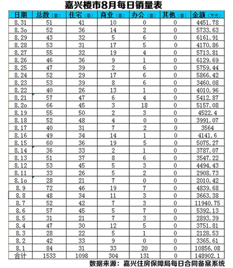 据嘉兴市住房保障局数据显示,嘉兴楼市8月成交各类商品房约1868套,成交金额约149565.22万元;其中普通住宅成交备案约1129套,商贸成交备案约305套,写字楼成交备案约132套,其他用房成交备案约302套。其中8月1日 ..