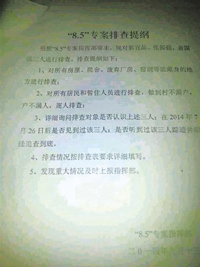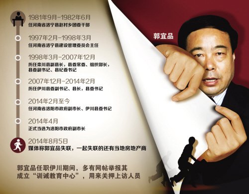 昨日上午,记者多方获悉,河南省洛阳市副市长郭宜品自8月5日起失联,一起失联的据信还有当地一房地产公司老总。目前,官方尚未对外披露失联原因及排查情况。 ![]() ![]() ![]() →当地回应 失联一事属实 事发已一个月有余 9月14日,“洛阳市副市长郭宜品带着当地一房地产公司老总等3人跑路”的消息开始在网上流传,并称当地警方已成立专案组进行排查。 昨日下午,洛阳市委宣传部一负责人证实,郭宜品失联一事属实,具体情况公安部门正在调查。一位政府人士告诉记者,郭宜品本来挂帅治理洛阳市的三轮车非法营运现象,并要求每天开会。但从7月底开始,包括当地主要领导在内,都已经联系不上他,会议也就停止了。 昨天下午,记者联系洛阳市纪检委,但工作人员回复称,此事不便于透露。记者询问郭宜品是否被纪委调查,工作人员称,因为级别问题,请记者询问省纪委具体事项。随后,记者拨打河南省纪检委宣传部的电话,其工作人员称目前并不知情。直到记者截稿时,仍未得到该部门回复。 公开资料显示,郭宜品在洛阳市副市长位子上不到半年。2007年12月至2014年2月,郭宜品历任伊川县委副书记、县长,县委书记。 目前,在洛阳市人民政府官方网站,已找不到郭宜品的名字及简历。 →排查 网帖称专案组 像“找越狱犯一样”找他们 9月14日起,陆续有网帖爆料称,郭宜品带着当地一房地产公司老总等3人跑路。“当地专案组正组织人员满世界找人,和几天前延寿县公安局满世界找高玉伦等3个越狱犯一样一样的。” 网帖还称,当地公安已成立专案指挥部,对郭宜品、张振强、俞国强3人进行排查。网帖还曝光了一份《“8·5”专案排查提纲》的文件。提纲中有3张男子的照片,分别是郭宜品以及当地某房地产公司老总张振强和俞国强。公开资料显示,俞国强为当地一家房地产公司董事长。 《排查提纲》称,对所有房屋、院舍、废弃厂房、窑洞等能藏身的地方进行排查;对所有居民和暂住人员进行排查,做到村不漏户、户不漏人、逐人排查;详细询问排查对象是否认识上述3人;在2014年7月26日后是否见到过这3人,是否听到过这3人踪迹并顺线追查到底;排查情况按排查要求详细填写;发现重大情况及时上报指挥部。 这份文件落款为“8·5专案指挥部”,落款时间为2014年9月13日。发帖者对记者称,“8·5”专案排查提纲来自当地政法系统。 随网帖流传的还有3张照片。其中一张照片中,5辆“特警”车辆呈“一字形”停放在乡镇街道路边。上传照片的网友称,照片拍摄地是河南省伊川县鸦岭乡。 鸦岭乡一位居民对记者称,在当地的排查从9月13日开始,来了很多jc,警察拿着3个人的照片请他辨认,“公安挨家挨户调查,好几个村同时进行。” 这位居民称,失联者之一的俞国强为鸦岭人。据知情人士告知,俞国强系洛阳怡鑫置业有限公司董事长,郭宜品与其一起自8月5日失联。 →履历 任职伊川时 因矿难被严重警告 目前,郭宜品失联原因和排查进展官方尚未披露。 昨日11时许,记者登录洛阳市政府官网,在政府领导一栏中,已无“副市长郭宜品”的相关信息。 公开报道显示,郭宜品最后一次出席活动,是今年7月30日至31日,河南省政府安委会第三督导组到洛阳检查汛期安全生产工作,郭宜品陪同检查。 现年52岁的郭宜品,今年2月正式当选为洛阳市政府副市长,主要分管市安监局、市煤炭局、市环保局、市交通运输局(市公路局)、市地震局。 郭宜品的仕途从洛阳市洛宁县开始。1981年,19岁的郭宜品为该县赵村乡团委干部,5年后进入县委政策研究室担任副主任。 进入县城的郭宜品与房地产开发开始产生交集。1994年2月至1997年2月,郭宜品成为洛宁县房管局局长、房地产开发总公司经理,此后还担任洛宁县建设管理委员会主任,为期1年。 1998年3月,郭宜品离开工作了17年的洛宁县,当选洛阳市栾川县副县长。2007年12月,其改任伊川县委书记。 其任职期间,2010年3月,伊川县国民煤业公司曾发生特别重大煤与瓦斯突出事故,44人死亡、6人下落不明,直接经济损失2728.4万元。事故遭国务院严处,45人被追究刑事责任,郭宜品受党内严重警告处分。 2014年2月,郭宜品走到了仕途又一高峰,当选为洛阳市副市长。 另据工商资料显示,洛阳怡鑫置业有限公司成立于2010年11月,注册资本8000万元,经营范围是房地产开发,法定代表人俞永生,另一自然人股东为张志良。 今年2月,俞国强作为伊川县代表,入选洛阳市第十四届人民代表大会代表候选人。而正是在那次人代会上,郭宜品当选为洛阳市副市长。 郭宜品资料图 □CFP供图 →追访 曾设训诫中心关押访民遭举报 记者检索发现,郭宜品任职伊川期间,多个网帖对其实名举报,且多集中举报其成立“训诫教育中心”,用来关押上访人员。伊川县位于洛阳市正南方,两地相距不到20公里。 伊川县白沙镇卫生院内科医生张少锋2011年、2013年曾两次被关押于伊川县训诫教育中心。从2013年3月至今,张少锋一直在对郭宜品涉嫌渎职、包庇违法违纪腐败分子等事进行举报。 昨日上午,张少锋向记者介绍,该训诫教育中心成立于2010年。据张少锋提供的图片显示,其全称为“伊川县处置非正常上访训诫教育中心”。 张少锋称,在训诫中心时,他的身份证、手机、上访材料都被抢走,“在里面生病也不让看。”他称,当时他患急性胆囊炎却不给治疗,“还不让吃饭,馒头放了一天才给吃;大冬天不让喝