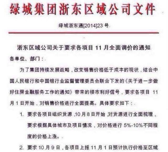 今日(10月1日)晚间,网上流传出一份疑为绿城集团浙东区域公司发布的《浙东区域公司关于要求各项目11月全面调价的通 ..