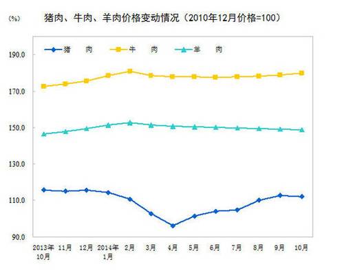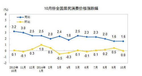 2014年10月份,全国居民消费价格总水平同比上涨1.6%。其中,城市上涨1.7%,农村上涨1.4%;食品价格上涨2.5%,非食品价格上涨1.2%;消费品价格上涨1.4%,服务价格上涨2.0%。1-10月平均, ..