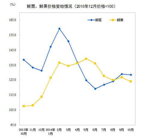 2014年10月份,全国居民消费价格总水平同比上涨1.6%。其中,城市上涨1.7%,农村上涨1.4%;食品价格上涨2.5%,非食品价格上涨1.2%;消费品价格上涨1.4%,服务价格上涨2.0%。1-10月平均,全国居民消费价格总水平比去年同期上涨2.1%。 10月份,全国居民消费价格总水平环比持平(涨跌幅度为0,下同)。其中,城市上涨0.1%,农村持平;食品价格下降0.2%,非食品价格上涨0.2%;消费品价格持平,服务价格上涨0.1%。 ![]() 一、各类商品及服务价格同比变动情况 10月份,食品价格同比上涨2.5%,影响居民消费价格总水平上涨约0.83个百分点。其中,蛋价上涨16.4%,影响居民消费价格总水平上涨约0.14个百分点;鲜果价格上涨15.2%,影响居民消费价格总水平上涨约0.30个百分点;粮食价格上涨3.5%,影响居民消费价格总水平上涨约0.10个百分点;水产品价格上涨3.2%,影响居民消费价格总水平上涨约0.08个百分点;肉禽及其制品价格上涨1.1%,影响居民消费价格总水平上涨约0.09个百分点(猪肉价格下降3.1%,影响居民消费价格总水平下降约0.10个百分点);鲜菜价格下降7.2%,影响居民消费价格总水平下降约0.24个百分点。 ![]() ![]() 烟酒及用品价格同比下降0.5%。其中,酒类价格下降1.6%,烟草价格上涨0.2%。 衣着价格同比上涨2.4%。其中,衣着加工服务费上涨5.3%,服装价格上涨2.4%。 家庭设备用品及维修服务价格同比上涨1.2%。其中,家庭服务及加工维修服务价格上涨7.6%,耐用消费品价格上涨0.2%。 医疗保健和个人用品价格同比上涨1.3%。其中,中药材及中成药价格上涨2.3%,医疗保健服务价格上涨1.2%,西药价格上涨0.8%。 交通和通信价格同比下降0.3%。其中,车用燃料及零配件价格下降4.9%,通信工具价格下降3.5%,交通工具价格下降0.8%,车辆使用及维修费上涨3.5%。 娱乐教育文化用品及服务价格同比上涨1.1%。其中,教育服务价格上涨3.0%,旅游价格下降2.3%。 居住价格同比上涨1.6%。其中,住房租金价格上涨2.7%,建房及装修材料价格上涨0.8%,水、电、燃料价格上涨0.5%。 据测算,在10月份1.6%的居民消费价格总水平同比涨幅中,去年价格上涨的翘尾因素约为0.3个百分点,新涨价因素约为1.3个百分点。 ![]() 二、各类商品及服务价格环比变动情况 10月份,食品价格环比下降0.2%。其中,鲜果价格下降2.2%,影响居民消费价格总水平下降约0.05个百分点;水产品价格下降1.0%,影响居民消费价格总水平下降约0.03个百分点;猪肉价格下降0.6%,影响居民消费价格总水平下降约0.02个百分点;鲜菜价格下降0.5%,影响居民消费价格总水平下降约0.01个百分点。 10月份,非食品价格环比上涨0.2%。其中,衣着、家庭设备用品及维修服务、居住、烟酒及用品、医疗保健和个人用品价格分别上涨1.0%、0.2%、0.2%、0.1%和0.1%;娱乐教育文化用品及服务价格持平;交通和通信价格下降0.3%。10月CPI同比涨1.6%与预测一致 ![]() |