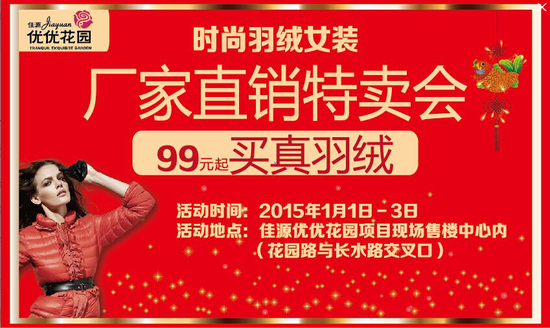 淘新衣、迎新年!2015年1月1日-3日优优花园售楼处现场举行“跨年狂欢购物季”品牌羽绒服厂家直销特卖会。大厦专柜品牌品质、厂家直销价格,99元起买真羽绒,超值不容错过。
