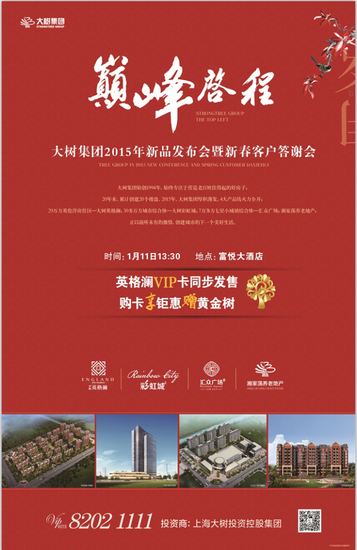 想要2015年新年开门红吗?大树来帮你! 大树官微的小树苗们,使劲欢腾起来,2015年大树新品发布会送黄金树啦!只要手指轻松点一点,黄金树抱回家,让你整整一年充满正能量。大树送金树,祝小树苗们2015年新年茁壮成长、收获满满成果! 活动方式: 即日起,只要转发官微活动页面,并截图至大树官微, 就有机会赢取富贵黄金树(三棵) 更有定制版健康电子称(10)台等你拿! 2015年的逆袭从树开始! 抽取方式:2015年1月11日大树集团新品发布会现场公开抽取 2015大树集团巅峰启程 大树集团始创于1994年,在嘉兴相继开发了大润发、大树花园、大华城市花园见证了大润发商圈的崛起、繁荣,更见证了秀洲新区的成长与壮大!再到大树银河湾、广宜文苑、嘉禾绿洲、福地广场、中纬大厦、大树·玫瑰恬园,在嘉兴全面铺开。20年20个项目精耕细作,使集团在嘉兴率先取得国家一级开发资质的房地产企业、也成为嘉兴人居和建筑行业的品质标杆。 2015年,大树集团厚积薄发,集结大树·英格澜、彩虹城、汇众广场、湘家荡养老地产4大产品线火力全开,立足集团深厚根基、以前所未有的激情,“羊”帆起航! 英格澜VIP卡荣耀首发享钜惠赠黄金树 大树20年感恩钜惠,集团将推出臻品卡系列优惠,以回馈新老业主一如既往的支持与厚爱。 1月11日大树集团2015新品发布暨新春客户答谢会将以英格澜为解读重点,同时推出仅限当天办理的VIP黑金卡,享存10000抵30000专享钜惠,成功购卡即送大树20周年纪念版富贵黄金树一枚(限100枚)、更有暖冬小家电等你拿!现场抽奖更可赢取Iphone6 、MINI等超值大礼,大树期待与您共襄盛举,共创美好生活! 2015大树集团新品发布暨新春客户答谢会 时间:1月11日13:30 地点:富悦大酒店 ![]() 英格澜的洋房生活 英格澜总占地29万方,融合了一期电梯洋房多层和二期宽景高层公寓,拥有3300亩城市中央公园,享受40万方彩虹城(暂定名)商业配套,一期主力户型为93—139㎡的花园洋房,首批房源已接受预定,项目正在火热持续中! 英格澜第一次将战略与地产相融合,第一次将生态融入地产,第一次将健康融入开发,第一次将阳光融入庭院,将7+电梯洋房的创新模式引入嘉兴国际商务区,必将开启全新的英格澜洋房生活! VIP/0573-82021111 临时售楼处地址/国际商务区五环洞路128号 |