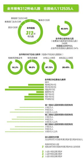 2014年学前教育发展水平情况公布 ![]() 晚报记者 沈爱君 实习生 平 阳 通讯员 陈春艳 制图 张利昌 中考和高考历来是千家万户的大事,但随着教育越来越受重视,家长们开始目光前移,密切关注学前教育的发展。前天,嘉兴市教育局公布了2014年全市学前教育发展水平情况,还提醒各县(市、区)特别要重视抓好三方面工作:一是坚持学前教育的公益和普惠基本要求,大力发展公益性幼儿园,严格执行幼儿园教师资格制度,努力提高优质幼儿园的比例;二是严格规范办园行为,有效防止和纠正学前教育“小学化”倾向,提升质量;三是加大无证幼儿园的清理整治力度,按照堵疏结合、属地负责的要求,对不具备办园条件的无证幼儿园依法予以取缔。 男幼儿老师逐渐增加 目前有39位了 幼儿园这样报名 年轻父母看过来 全市312所幼儿园 公益性的有246所 记者从公报中了解到,全市现有312所幼儿园,在园幼儿总数为112535人。其中南湖区有幼儿园54所,在园幼儿20306人;秀洲区有幼儿园43所,在园幼儿13174人;嘉善县有幼儿园30所,在园幼儿11711人;海盐县有幼儿园35所,在园幼儿10590人;海宁市有幼儿园66所,在园幼儿19875人;平湖市有幼儿园45所,在园幼儿13588人;桐乡市有幼儿园39所,在园幼儿23291人。 在这些幼儿园中,集体办和民办幼儿园占了多数,其中集体办的有135所,占总数的43.27%;民办的有130所,占总数的41.67;另外有23所由教育部门主办,24所由其他部门主办。 公报同时公布了我市的公益性幼儿园情况。公益性幼儿园是指收费实行政府定价的幼儿园,包含了公办幼儿园和部分民办幼儿园。目前我市有公益性幼儿园246所,在园幼儿94014人,占全市总在园幼儿数的83.54%,比2013年增加了1.14个百分点。 据统计,2011年至2013年,我市共新建、改(扩)建幼儿园120所,新增优质学额约2.3万个。全市67个镇(街道)均建立了中心幼儿园,中心园等级率达到100%,公办率达到100%。全市幼儿园各类教玩具配备率已达95.52%,比2010年提高了23.82个百分点。幼儿园增加事业编制得到落实,吸引和稳定了优秀人才从事幼儿教育工作,尤其为乡镇中心幼儿园增添了骨干教师,促进了农村学前教育优质均衡发展。 师资队伍也是社会关注的重要内容。此次公报显示,全市有6987位幼儿教师,其中包括476位幼儿园园长。这些幼儿教师的学历合格率为99.5%,其中87.72%的幼儿教师有大专以上学历,28.45%的幼儿教师有本科及以上学历;75.84%的幼儿教师已评相关职称;91.2%的幼儿教师有教师资格证书,其中平湖市100%有教师资格证;21.5%的幼儿教师有事业单位编制。 2012年,全市非事业编制教师平均年收入为35799元,比2011年增长9744元。非编教师年收入已达到在编教师年收入的80%,2013年非编教师的平均年收入为4.6万元左右。 统计显示,我市从事幼儿教育的男教师也在逐渐增加。目前我市有39位男幼儿教师,其中南湖区有4位,秀洲区有9位,海盐有10位,嘉善有2位,海宁有4位,桐乡有5位,平湖有5位。 诺亚舟庆安幼教集团在嘉兴全市有18所幼儿园,共有男教师6位,其中2位是男外教。总园长曹莉说,女老师以自己的耐心细致和母性,在幼儿教育中有优势,但男老师的优势也很明显,比如在生命教育、抗挫折教育等方面,男老师会更有带动作用,因为男老师会大胆鼓励幼儿进行一些挑战。因此,从幼儿的完满人格培养上来看,幼儿教育最好是以女老师为主,同时有男老师来弥补女老师的柔弱,让孩子更开朗。 房红毅今年35岁,2002年进入庆安幼教集团,因为他的专业正好是钢琴和轮滑,进入幼儿园后担任体能教师。担任幼儿教师10多年,他对自己目前的状态很满意,并且认为,随着社会观念更加开明,从事幼儿教育的男老师会越来越多。根据他的了解,浙江从事幼儿教育的男老师还不算多,而上海就明显要多,“要吸引男老师从事幼儿教育,一是要有稳定的收入,二是需要社会的理解和家长的支持,有了这些,男老师也会对自己的幼教工作有成就感。” 看到这里,年轻的爸爸妈妈们肯定很想知道孩子将来怎样入读幼儿园。 《市本级2014年幼儿园招生工作的指导意见》中规定,各幼儿园要严格控制班额,不得突破省现定的班额标准。其中,省一级幼儿园的班额分别控制在:小班25人、中班30人、大班35人以内;省二级幼儿园的班额分别控制在:小班28人、中班33人、大班38人以内;省三级幼儿园的班额分别控制在:小班30人、中班35人、大班40人以内。 幼儿园招生时间由所在区的教育行政部门统一安排,其中预报名登记时间不少于两天。各区教育行政部门要通过网站等渠道向社会公开本行政区域幼儿园招生工作方案和区域内各幼儿园基本情况。各幼儿园将本园有关情况及时在园公告栏或网站上公告。各幼儿园根据区教育行政部门确定的时间和条件,接受幼儿预报名登记,对具有市本级常住户口的适龄儿童应优先给予预报名登记。幼儿园根据区教育行政部门的有关招生办法进行录取,对于预报名数超过招生计划数的幼儿园,在教育行政部门等的监督下实行电脑派位。如幼儿经电脑派位后未被录取,则由辖区教育行政部门根据实际情况推荐到其他尚有招生能力的幼儿园。 幼儿园招生对象为当年8月31日前年满3周岁至5周岁的幼儿。有条件的幼儿园,经所在地教育行政部门批准可举办招收年满2周岁幼儿的托班。入读小班的幼儿年龄应满3周岁;入读中班的幼儿年龄应满4周岁;入读大班的幼儿年龄应满5周岁。在
