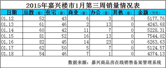 据统计,嘉兴市上周(01.12~01.18)共计成交商品房约452套,其中普通住宅324套,商贸61套,办公67套,其他0套——总销售金额达37956.1万元,住宅成交均价6971元/㎡,累计备案成交面积5万平方米。