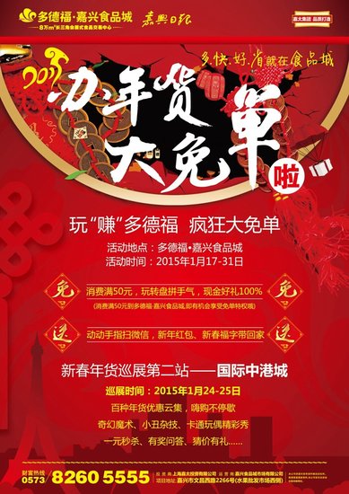 【约吗】食品城“会移动的年货 新春年货巡展”第二站,马上登陆啦! 食品城“会移动的年货 新春年货巡展”江南摩尔首站取得了巨大的成功,不少市民朋友反映,身边还有很多亲朋好友都还没来得及采购,你们就撤场了,好遗憾,要是能多举办几天就好了!不用遗憾,不用着急,我们第二站巡展工作已经在飞速的准备中了,这周末我们相约国际中港城! 百种年货优惠云集,奇幻魔术、小丑杂技、互动小游戏……通通少不了! ![]() 小编要提醒大家一定要看清楚我们的活动内容哦! 消费满50元到多德福嘉兴食品城 ,就有机会享受免单特权呦! (免单,大家都懂的……) ![]() 优惠不止要有,还要够大、够惊爆! 血拼!怎么拼? 拼价格!拼质量!以最优惠的价格购得最优质的产品,在食品城,这绝对是so easy的事情! “会移动的年货 新春年货巡展”中港城站,2015年1月24、25日,就要拼个够本,拼个爽快!年货采购不在食品城,绝对是您的损失,所以快快行动吧,周末带上亲朋,带上好友,囤年货咯! 食品城“会移动的年货 新春年货巡展”第二站地址:嘉兴国际中港城 食品城地址:嘉兴市文昌西路2266号(水果批发市场西侧) |